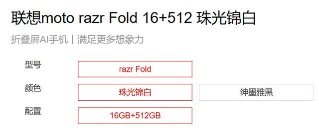 商品页面显示,联想moto razr Fold的储存规格为16GB+512GB,有白、黑两色。